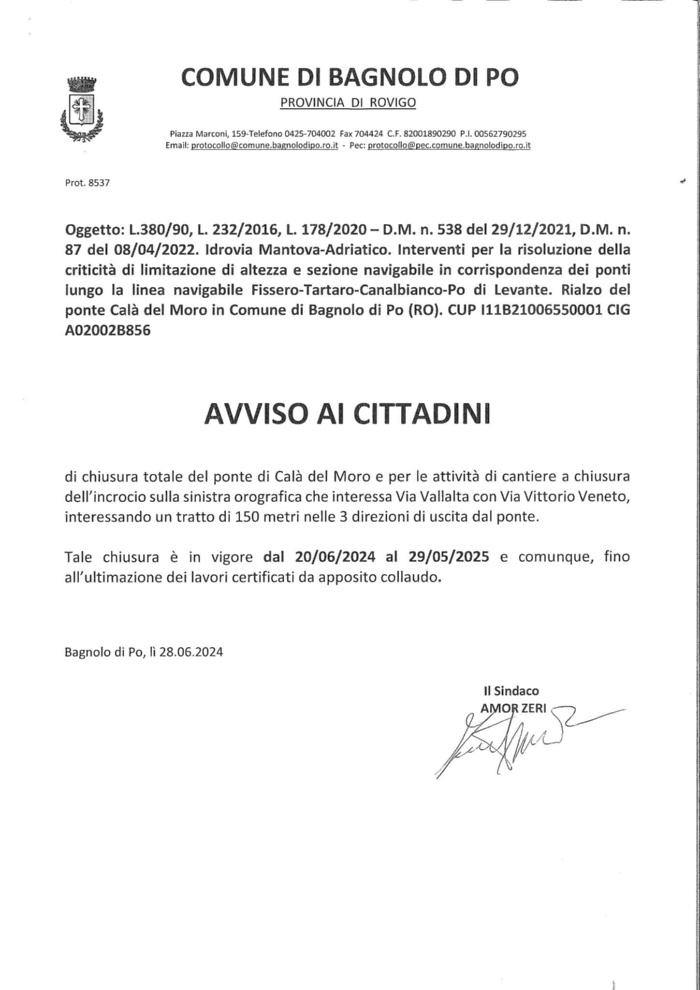 Si avvisano i cittadini della chiusura totale del ponte di Calà del Moro dal 20/06/2024 al 29/05/2025 e comunque, fino all'ultimazione dei lavori certificati da apposito collaudo.